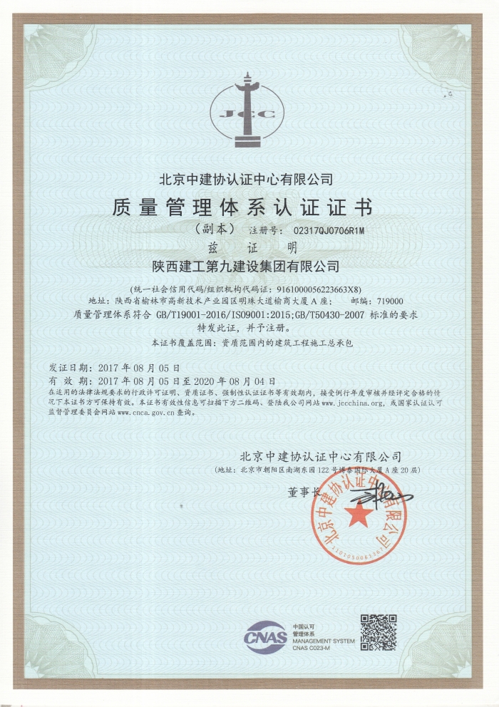 質量管理體系認證證書